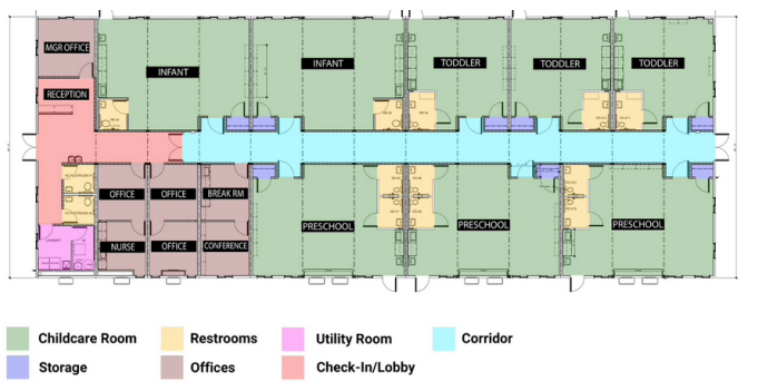 Whitley teamed up with a Sunbelt Dealer to create a daycare and preschool for the community. The modular built daycare and preschool is comprised of thirteen modules featuring various learning/care areas for a variety of ages of children, offices, reception area, and thirteen restrooms.