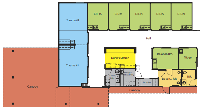 The hospital needed to expand E. R. capacity beyond what was offered by the existing building (built in 1974). They also needed to provide secure entry to the E. R., add clean / dirty utility areas, offer triage services, increase patient privacy, and provide additional capacity. For this technically demanding health care project, the hospital selected a Sunbelt Dealer, who partnered with WhitleyEvergreen to construct the facility.