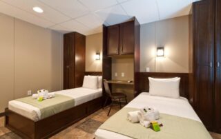 Five sleeping wings feature private and semi-private rooms with ADA-compliant options, while the main lobby offers reception, laundry, offices, conference rooms, a fitness area, recreation lounge, and dining space. Guest rooms were fully furnished with built-in furniture and appliances for comfort and convenience.